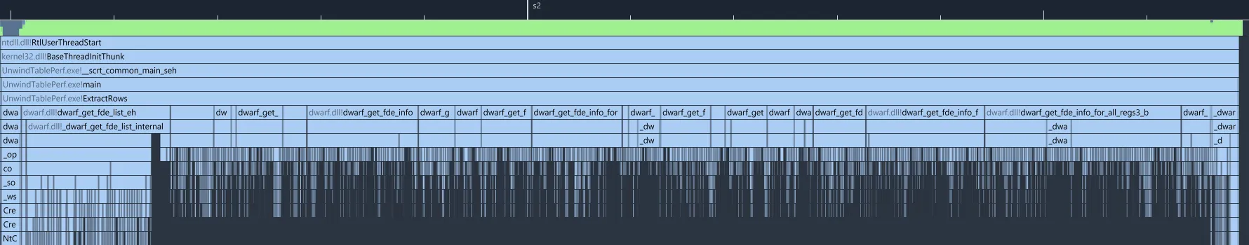 We’re using libdwarf to iterate through all rows, and for our test code we’re only iterating; we’re not actually performing any other work as we would in a real scenario. This is so that we can profile just the iteration part. The main API in libdwarf to iterate through the unwind rows is dwarf_get_fde_info_for_all_regs3_b: