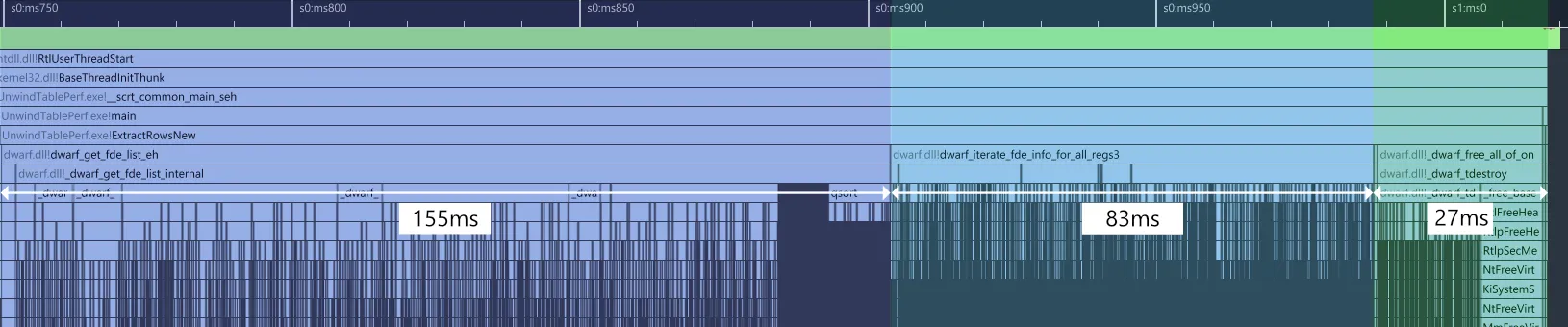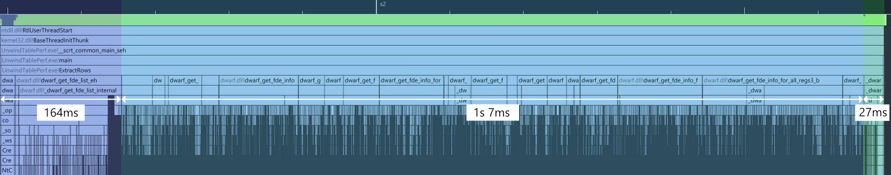 The bytecode’s specific details aren’t critical here (see the linked article if curious); what matters is extracting the full unwind table from a binary as fast as possible. The reason for this is that our sampling code relies on this data to collect stack traces as described earlier: we won’t be able to collect samples until this data has been extracted. This can result in profiling data missing from the capture if this process takes too long.